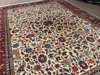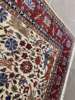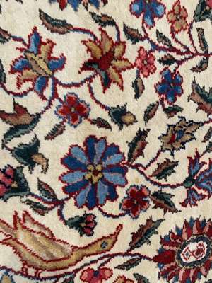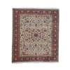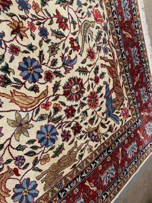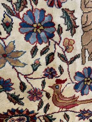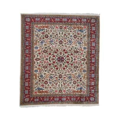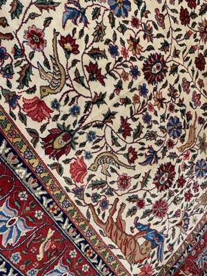 the cream field with small rosette medallion, allover foliate vine and bird pattern, within red border