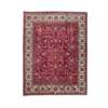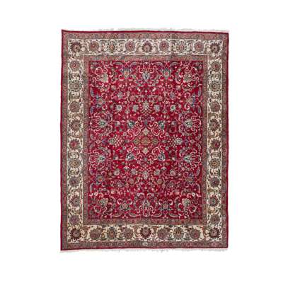 the crimson red field with allover palmette and foliate vine pattern, within ivory border, signature to one end