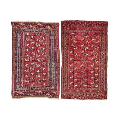 one Tekke, the red field with three columns of guls, within narrow red border; the other Yomut, with allover gul pattern, within narrow red double border (2)