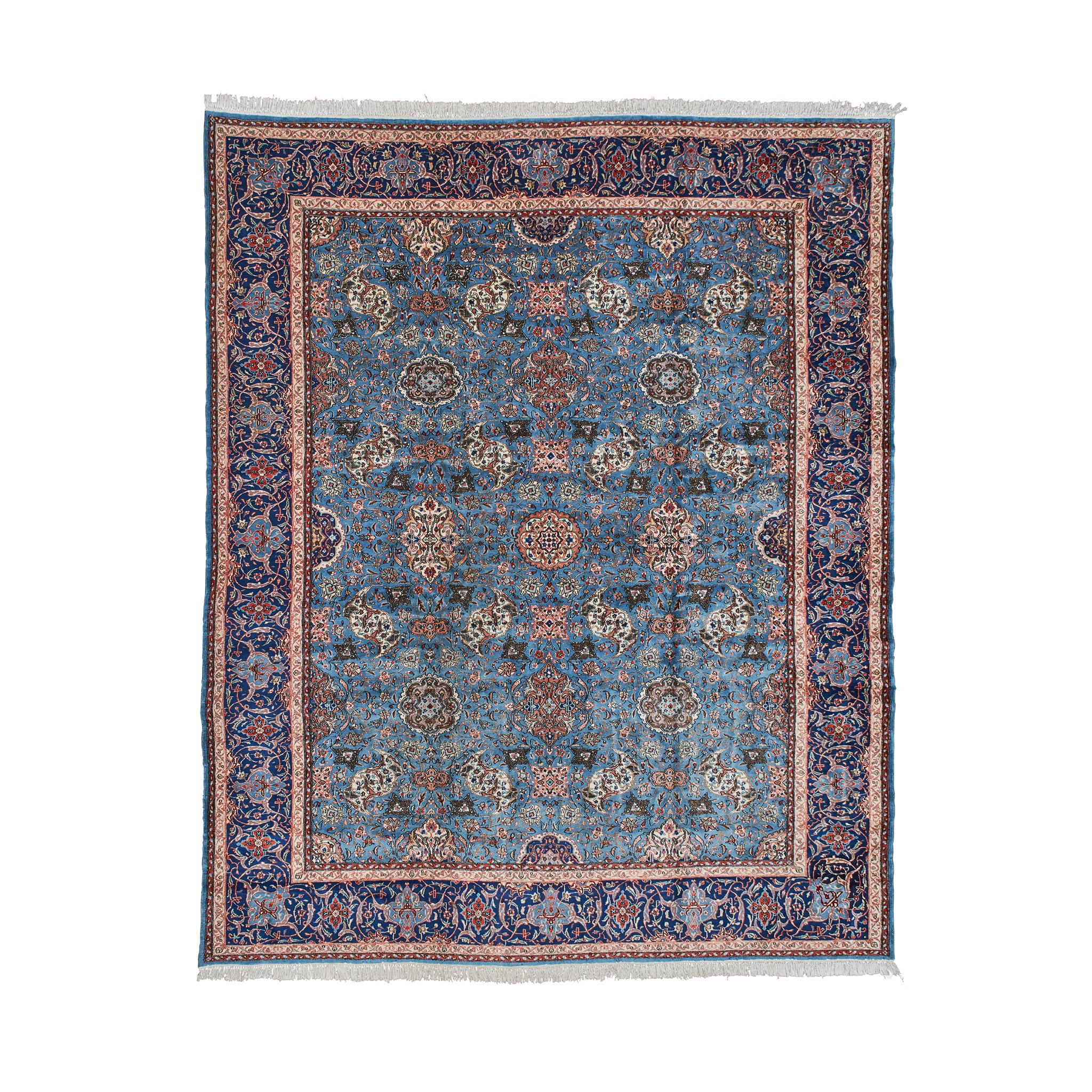 the light blue field with allover shaped medallion pattern, within indigo border