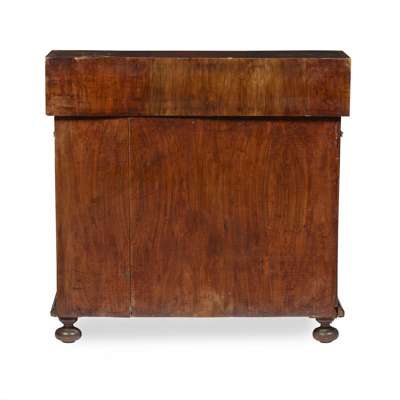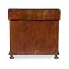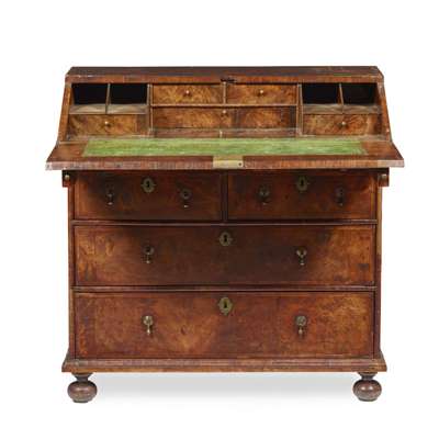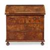 the crossbanded and featherbanded slope front opening to an arrangement of pigeon holes, drawers and a covered recess, over two short and two long drawers raised on bun feet