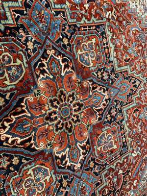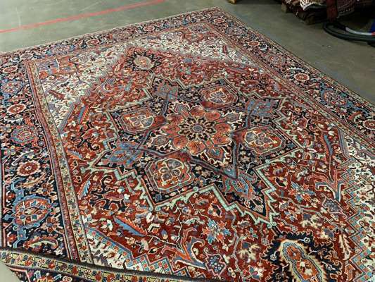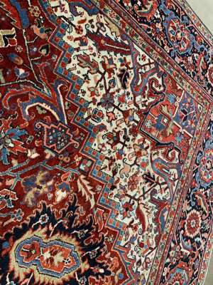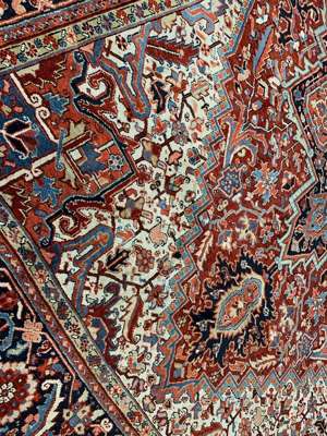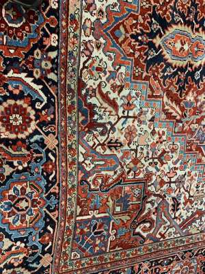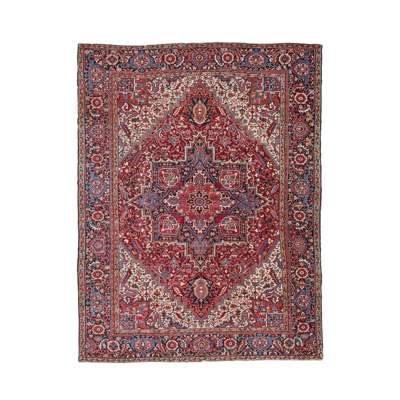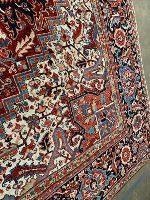 the red field with indigo star medallion, ivory and salmon pink spandrels, within indigo border
