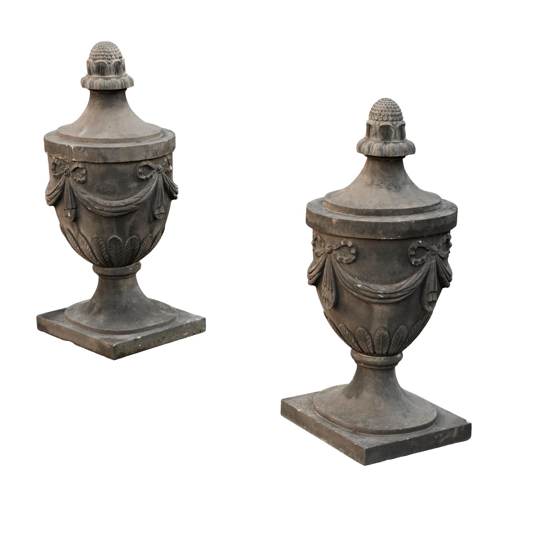 PAIR OF CARVED SANDSTONE ADAM STYLE URNS