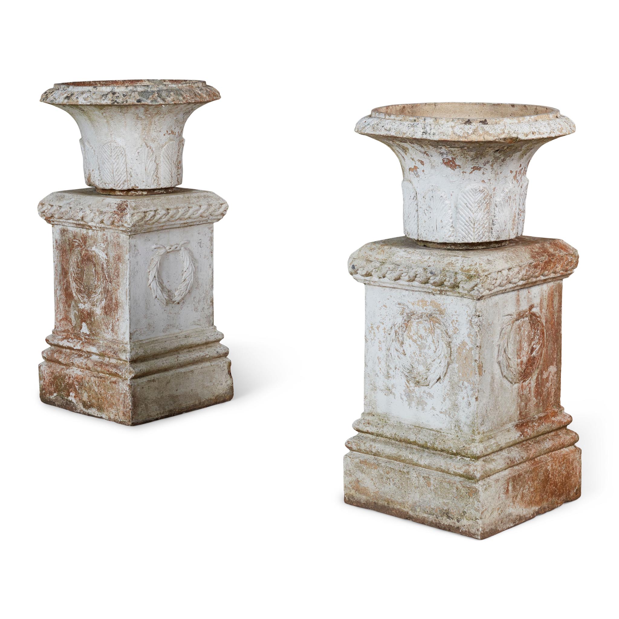 the urns with everted leaf-cast rims with bodies moulded with rising acanthus and palmettes, on square pedestals with moulded laurel wreaths
