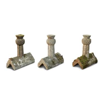 including three with carved raised thistle finials, two with pomegranates, together with five plain ridge sections of various lengths