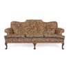 the low back with a scrolled and shaped top rail above a three cushion seat flanked by low scrolled arms, upholstered in needlework covers depicting a dancing couple, birds, and flowers, raised on short shell-carved cabriole legs ending in pad feet