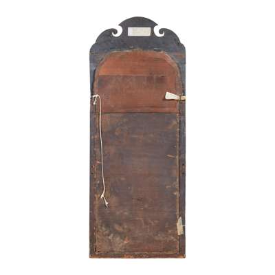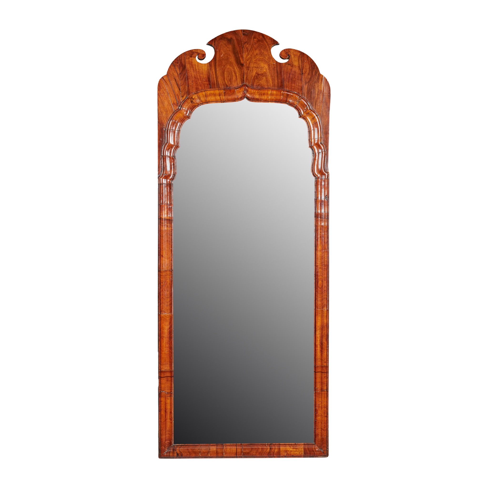 the bevelled shaped arch divided mirror plate in a moulded inner frame with a scroll pediment