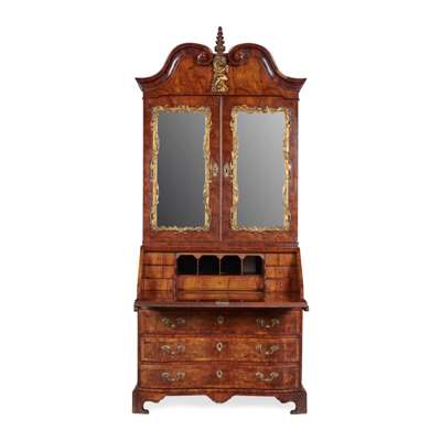 the moulded swan neck pediment centred by a carved gilt foliate finial above a frieze with a gilt carved putto, over a pair of mirrored doors with giltwood flowering vine borders, opening to a shelved interior; the lower part with a slope front enclosing an arrangement of pigeon holes and shelves and a covered well, above three long serpentine drawers and raised on shaped bracket feet