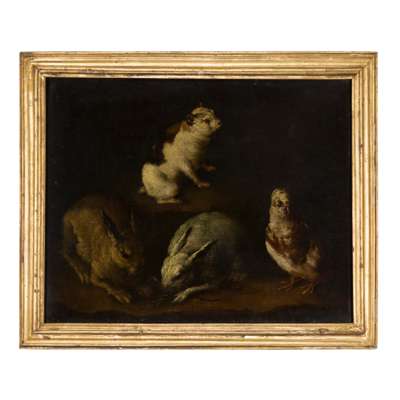 RABBITS, DOVE AND A GUINEA PIG IN AN INTERIOR