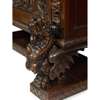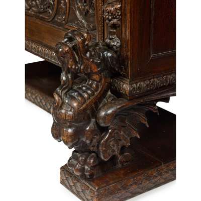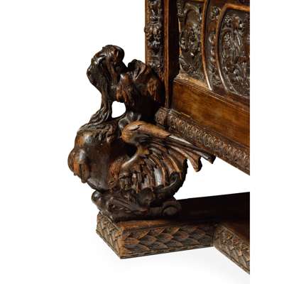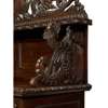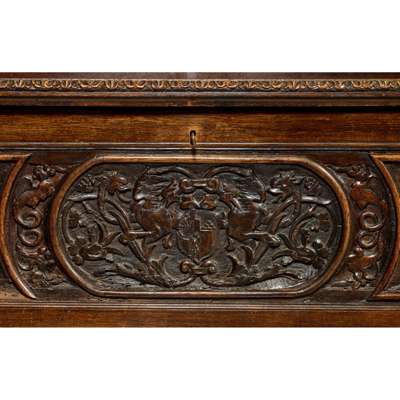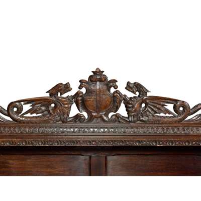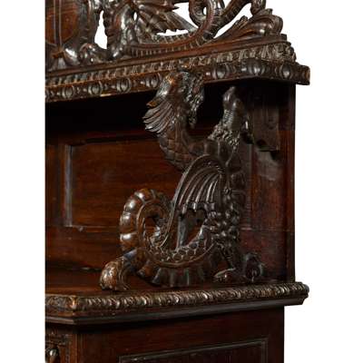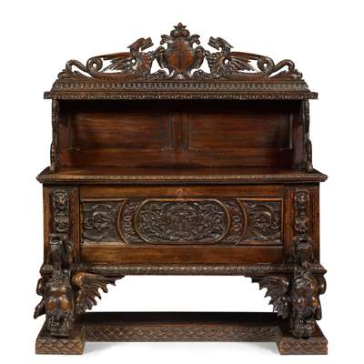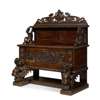 the superstructure with a single shelf surmounted by a pierced and carved cresting with a central cartouche flanked by dragons, on similar dragon shelf supports; the lower part with a carved panel fall front centrally carved with an armorial flanked by mythical beasts and foliate scrolls, flanked by lion mask pilasters, and raised on robustly carved winged dragon support on an inverted breakfront plinth