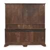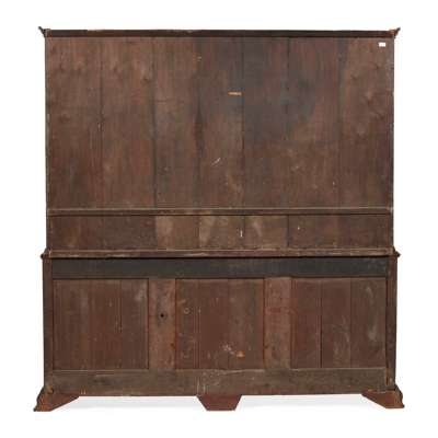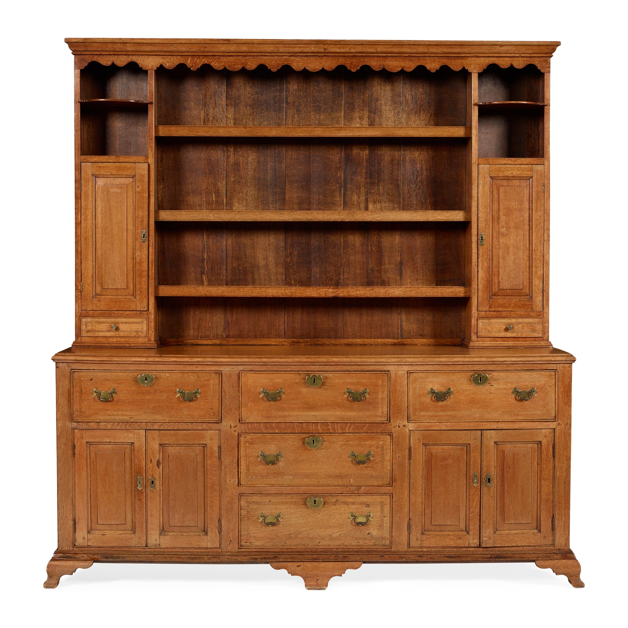 the moulded cornice above a shaped frieze over three enclosed shelves flanked by bow-front shelved niches over fielded panel cupboards and spice drawers; the base with three deep frieze drawers over four further fielded panel doors and two further drawers, raised on ogee bracket feet