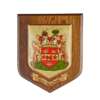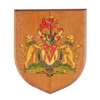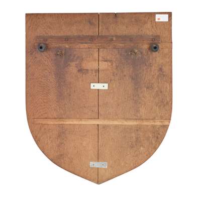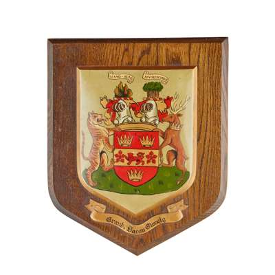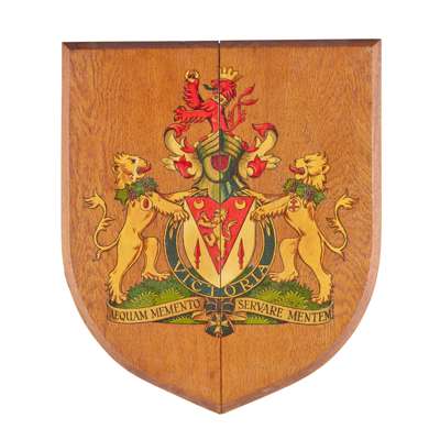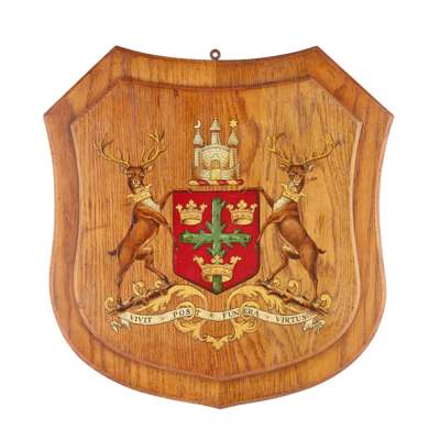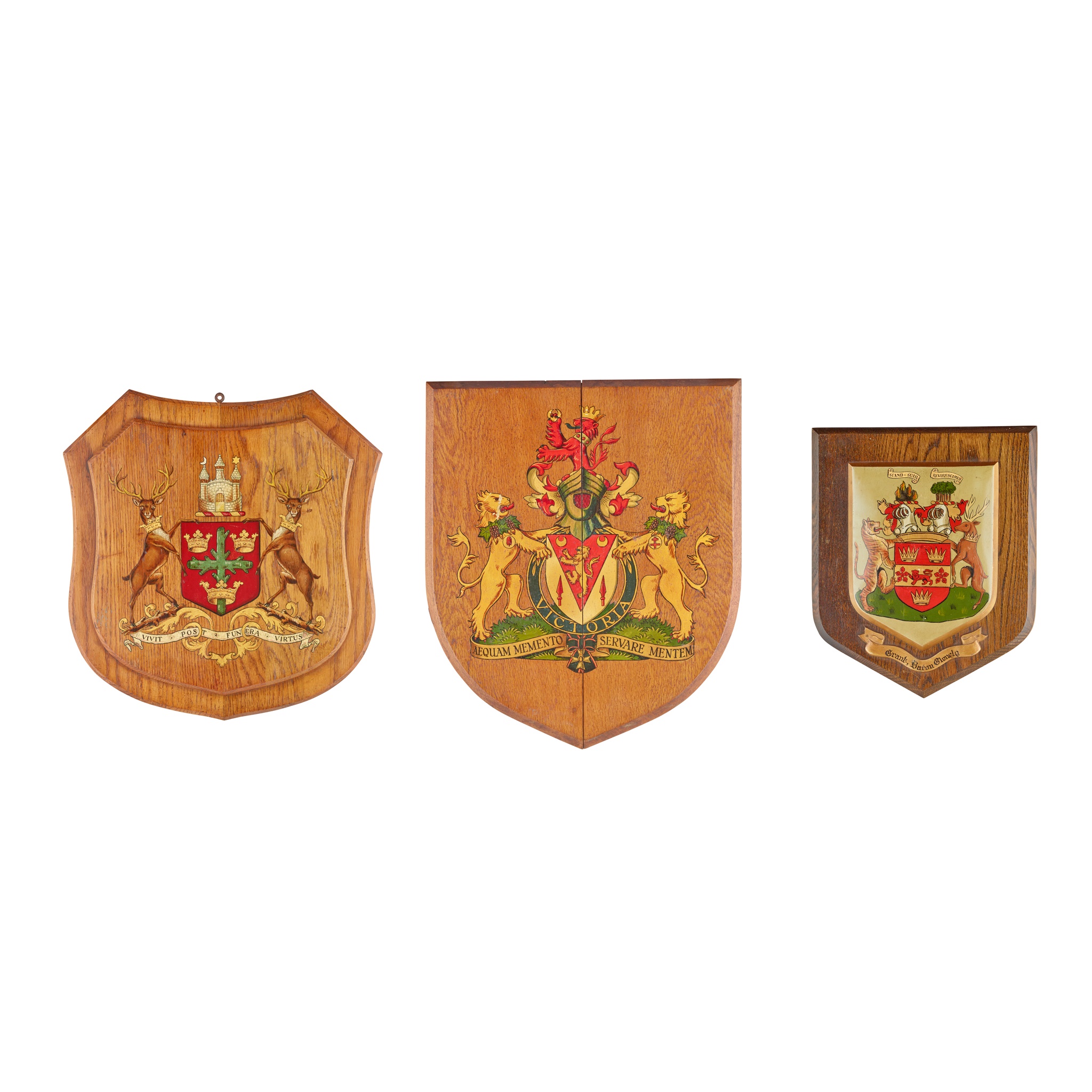 the first with a helmet crest issuing a rampant leopard flanked by two leopard supporters and motto 'Aequam memento servare mentem'; the second with the arms of the City of Nottingham with a three towered castle crest flanked by two stag supporters with motto 'Vivit post funera virtus'; and the third the arms of Charles Grant, 1st Baron Glenelg