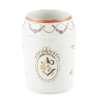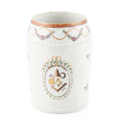 of barrel form with beaded bands and entwined bifurcated strap handles; enamelled with Masonic symbols and flower sprays and garlands