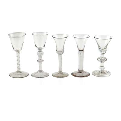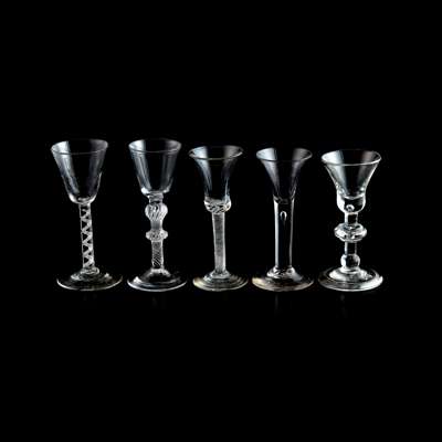 comprising three with air-twist stems, 17cm and 16cm high; a glass with an annulated knopped stem and folded foot, 15.5cm high; and a glass with an air-bubble to its straight stem, 16cm high