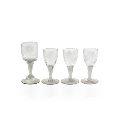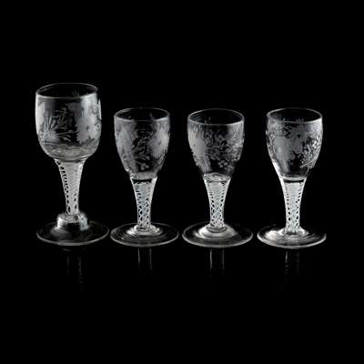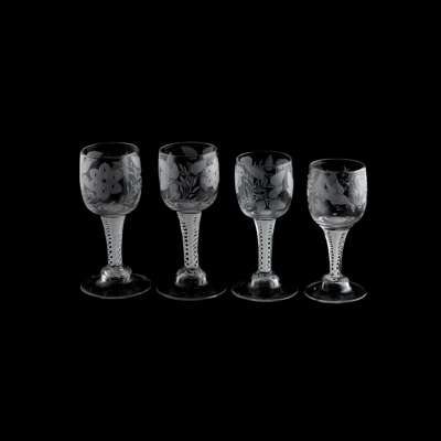 of varying size, comprising five glasses with domed feet, largest 18cm high; and three small glasses with conical feet, 13cm high; all wheel-engraved, depicting roses, butterflies and birds