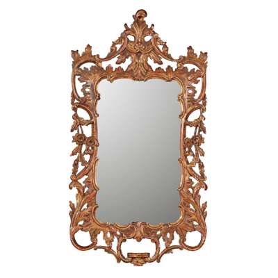 the shaped rectangular mirror plate in pierced rococo frame carved with C and foliate scrolls with trailing flower garlands