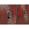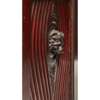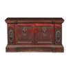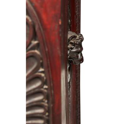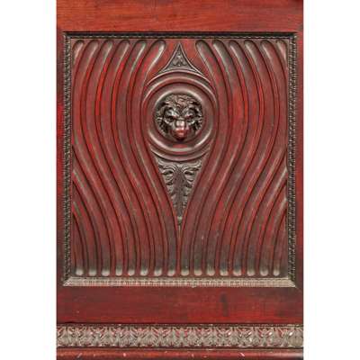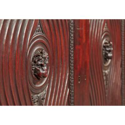 the inverted breakfront top over a leaf tip carved frieze, above a pair of carved fluted panel doors centred by lions masks and flanked by large elliptical flower motifs, opening to a shelved interior, the side panels similarly carved, on a conforming plinth base with further carved leaf tip moulding
