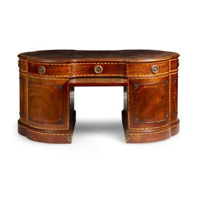 LATE GEORGE III MAHOGANY, TULIPWOOD, AND SATINWOOD PEDESTAL DESK