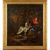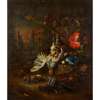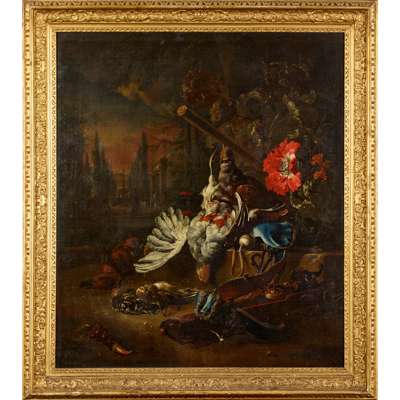 A STILL LIFE OF DEAD GAME, A FORMAL GARDEN IN THE DISTANCE