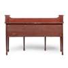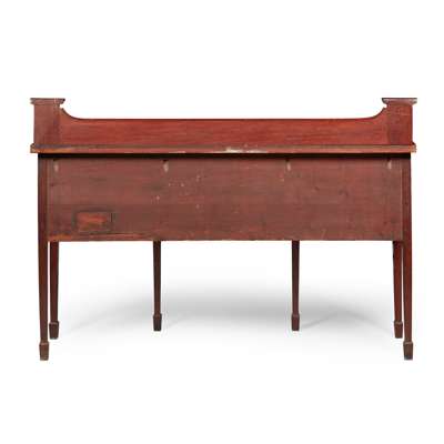 the back panel centred by an inlaid shell motif, above a frieze drawer and shaped arch flanked by drawers, raised on square tapered legs ending in spade feet