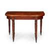 the D shaped fold-over top opening on a scissor action with three leaf inserts, raised on turned and tapered legs with brass caps and castors