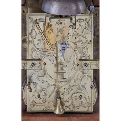 the bell top case with a brass handle above an arched brass dial with silvered chapter with Roman number hours, twin winding holes, calendar aperture, and Strike/ Silent dial to the arch, signed 'George Holdway/ Strand London'; the engraved backplate enclosing an eight day bell-strike twin-train movement with bob pendulum
