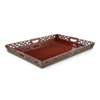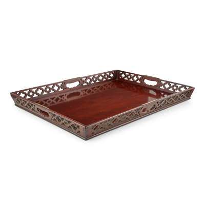 There are signs of some fine splits/cracks to the surface of the tray, the longest is approx 10cm long, and near this crack there are several scrapes, one of which is fairly long and deep (approx 10cm). There are some other signs of typical light scrapes and wear to the surface, commensurate with age and use. The corners of the tray have signs of surface wear, exposure and use and there are signs of slight shrinkage/gaps in some of the corner joints. One of the corners has signs of slight filling/restoration to the joints. There are signs of some splits and cracks to the pierced fretwork, and some signs of occasional slight restoration. One area of the pierced fretwork is slightly mobile as it is cracked in several places. There are some cracks/splits along the rounded edge of the base of the tray.