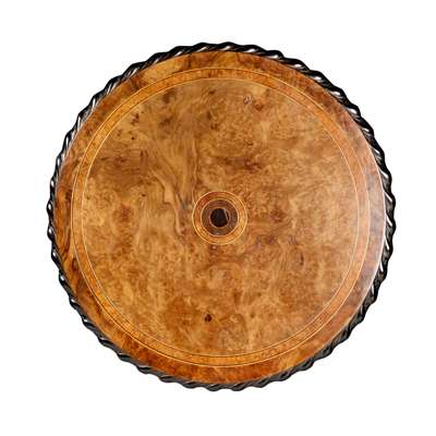 the circular top with an ebonised and gadrooned edge, inlaid with bands of exotic woods, on an octagonal column raised on foliate carved quadripartite cabriole legs