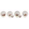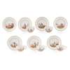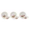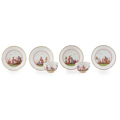 painted with Chinoiserie scenes depicting figures engaged in various pursuits, within concentric iron-red circles, with gilt rims, comprising five teacups and seven saucers, blue crossed swords, impressed numerals, gilt no.4