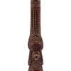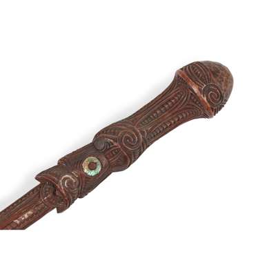 wood and shell, carved throughout with notched detailing of scrolls and waves, with a series of five tiki running along the shaft, each inlaid with pāua shell eyes