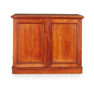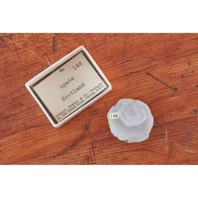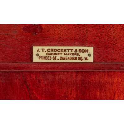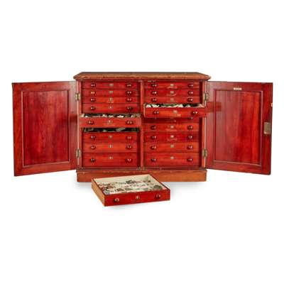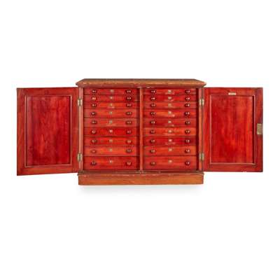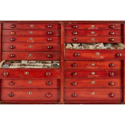 the cabinet with a pair of moulded doors opening to an arrangement of eighteen graduated drawers containing a large quantity of rock and mineral specimens, many identified with labels for 'GREGORY, BOTTLEY & Co. Geologists/ 30 Old Church Street/ Chelsea, S.W.3'; the cabinet with maker's label 'JT CROCKETT & SON/ CABINETMAKERS/ PRINCES ST., CAVENDISH SQ. W.'