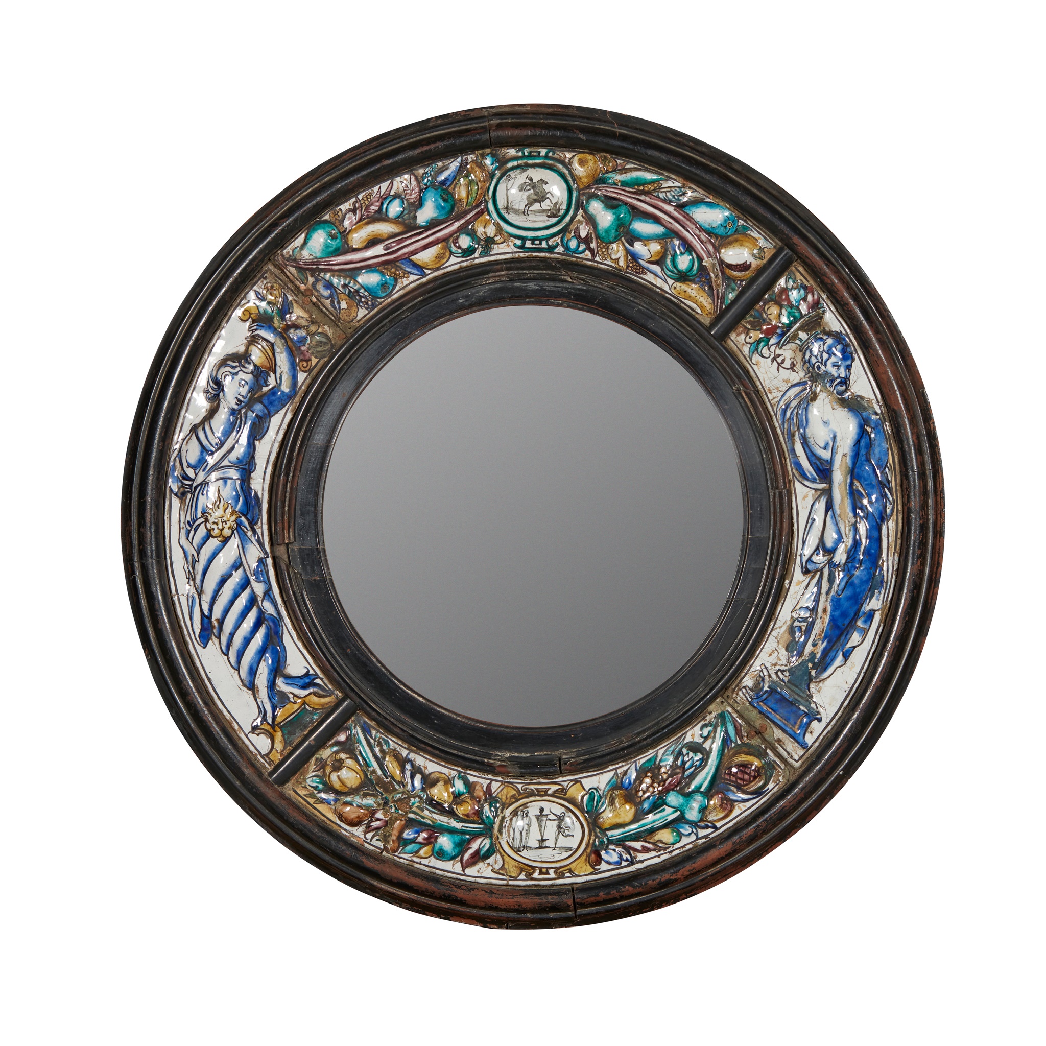 the mirror plate enclosed by four relief enamel on copper margin plates depicting figures representing Abundance and fruit-filled garlands, in a moulded ebonised frame