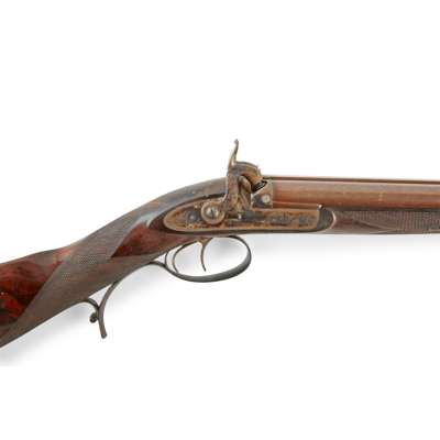 with re-browned Damascus barrels, central raised rib and folding leaf sights, with cross-over stock, engraved patch box and original ram rod, signed on each lock PURDEY, rubbed engraving to the top rib at breech, serial no. 5899