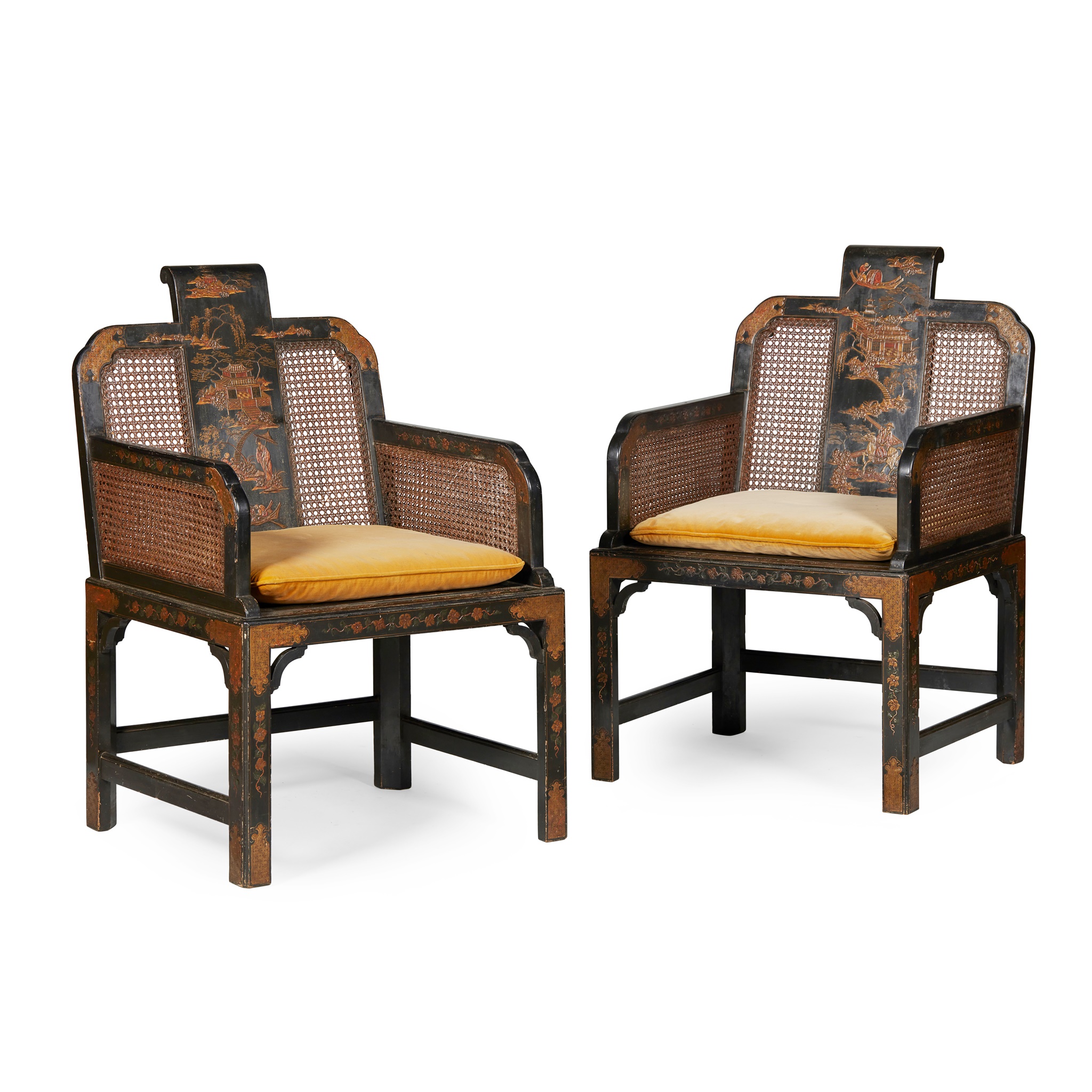 PAIR OF EDWARDIAN BLACK LACQUER 'CHINESE' BERGERES