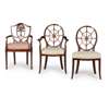 in the Sheraton style, comprising a wheel-back armchair and side chair with stuffover seats, and a shield back armchair with a caned seat and loose cushion, variously painted with fan medallions, harebell trails, and a portrait of a lady