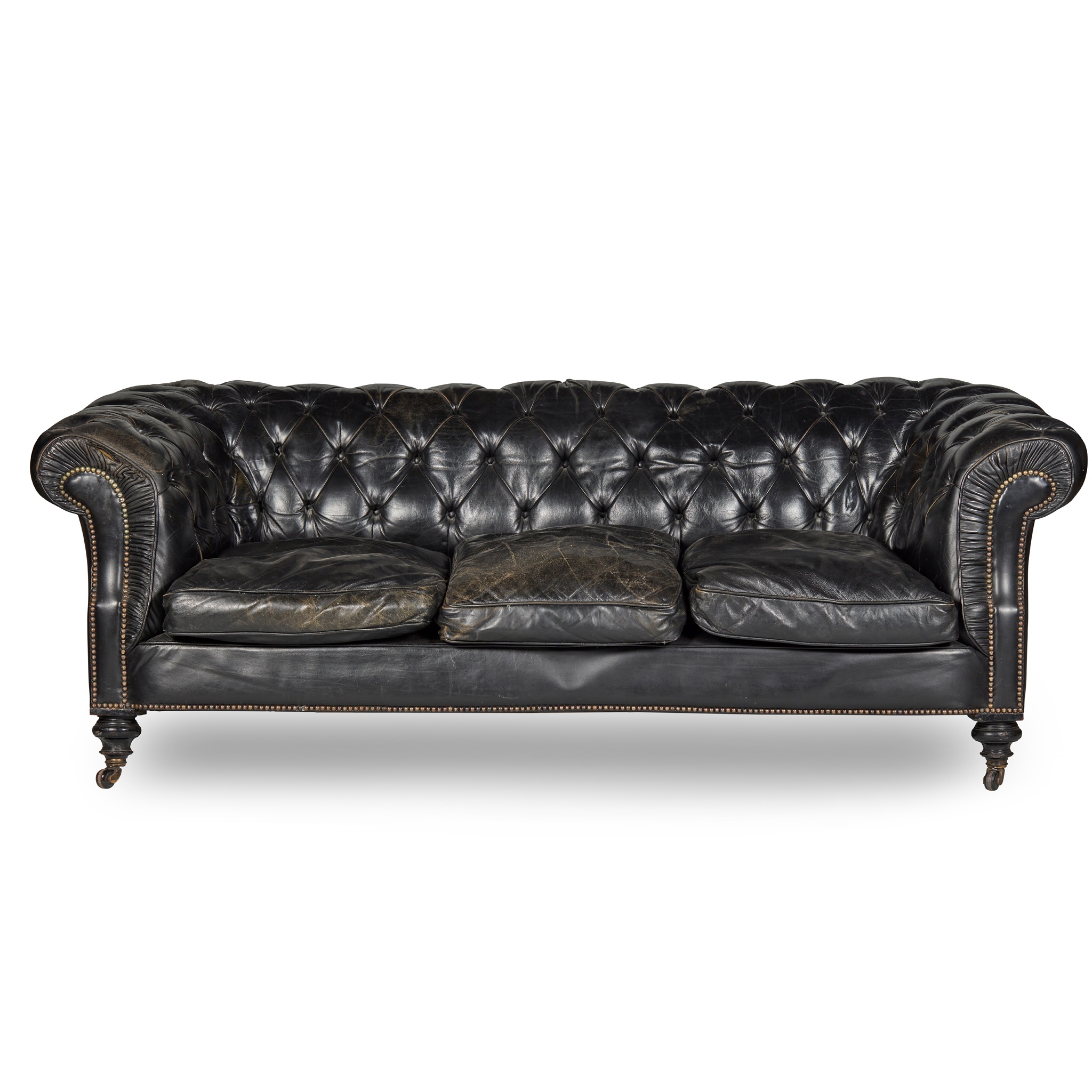 traditional form in black button upholstered leather, on turned legs with ceramic castors