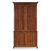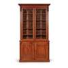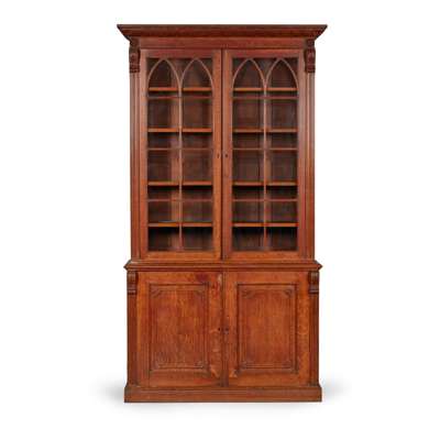 the foliate carved cornice above a pair of Gothic arch astragal glazed doors enclosing adjustable shelves; the base with twin panel doors enclosing adjustable shelves, on a plinth base