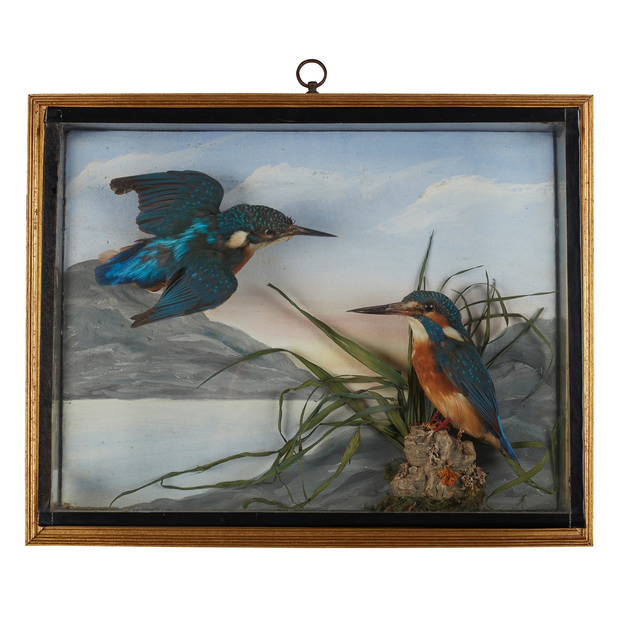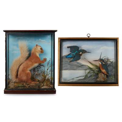 comprising a green parakeet, hand painted verso HP/ 1890/ 67 Jal* Road Brixton, 29cm wide, 52.5cm high; two kingfishers with label verso for C. N. Allen, Reading, in a shadow-box frame, 38cm wide, 30.5cm high; a red squirrel holding a nut, 26cm wide, 31cm high; and a barn owl, 34cm wide, 40cm high