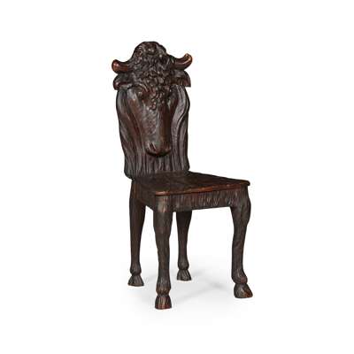the back carved with a bull's mask, over a 'hair' seat raised on carved legs with hoof feet