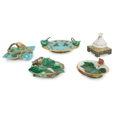 GROUP OF FIVE VICTORIAN MAJOLICA SERVING PIECES BY GEORGE JONES