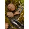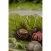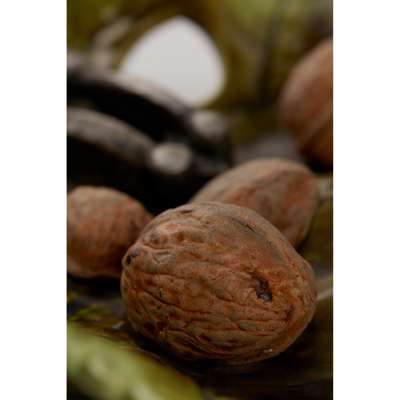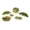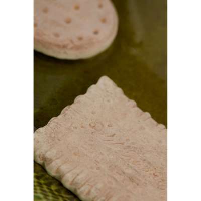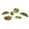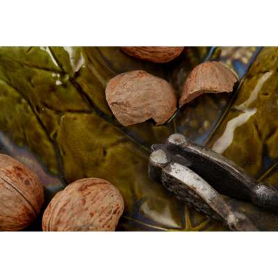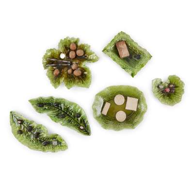 comprising a pair of leaf shaped and moulded dishes carrying dark chocolates; another smaller similar example; a five point leaf shaped dish displaying a nut cracker, walnuts and cracked walnut shells; a frill-rimmed dish laid with biscuits; and a rectangular dish moulded with a lace rim, holding a card case and some coins; impressed factory marks and numerals