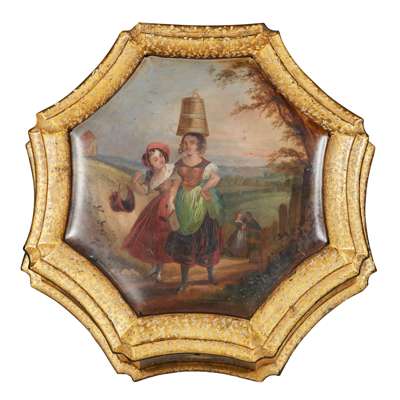 the shaped octagonal top painted with a milkmaid and companion on a country lane, opening to a fitted interior with various beads, trimmings, and sewing instruments, on a tapered and turned baluster support and quadripartite base with scroll feet