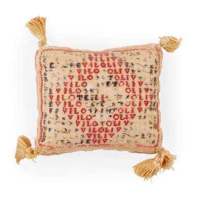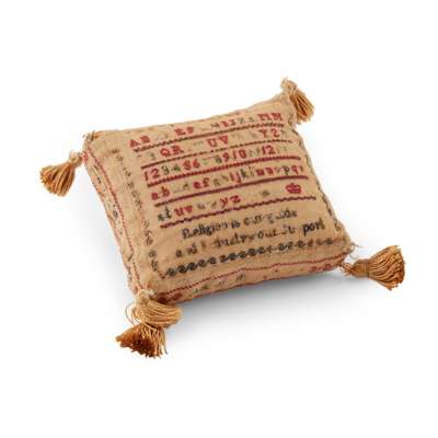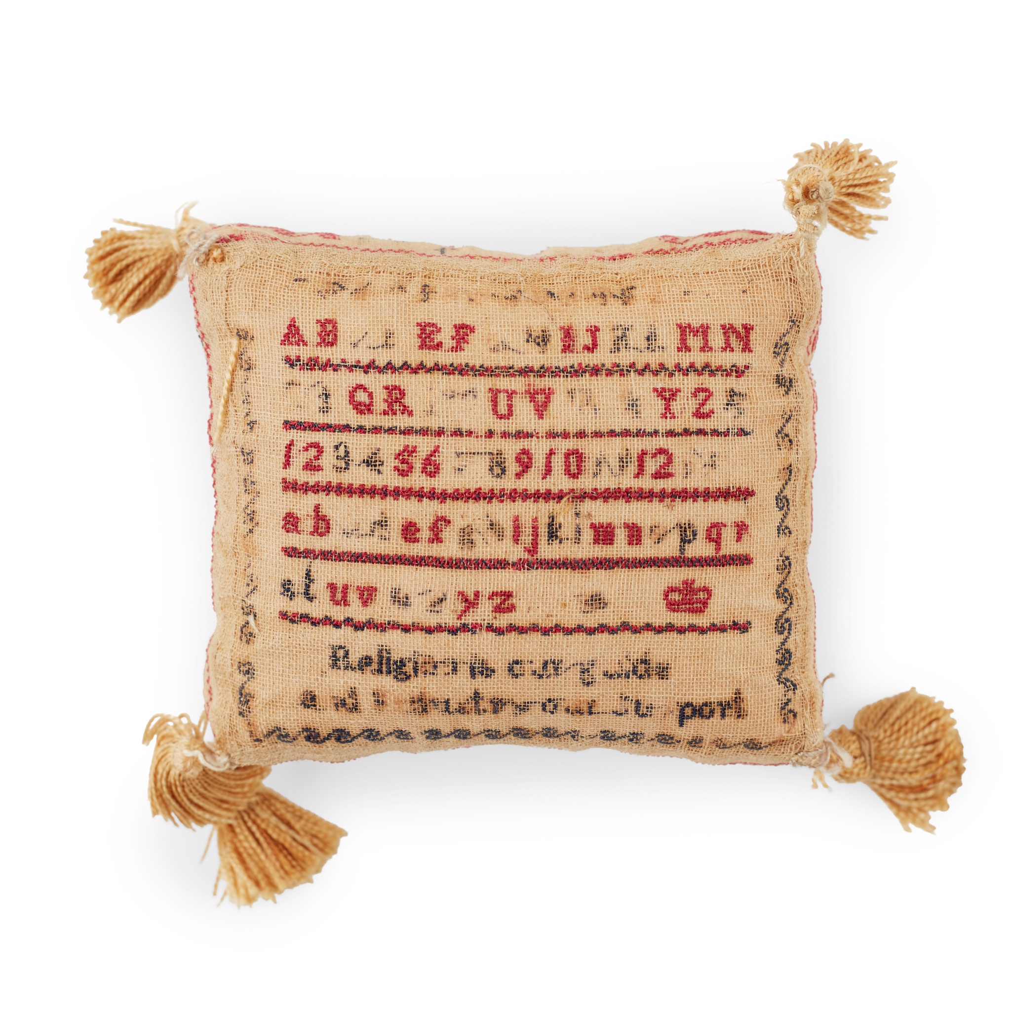decorated with an alphabet and numbers above a short verse to one side, and with diamond-form text to the opposing side, embroidered 'Female orphan' to one end, with tassels to the corners