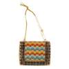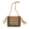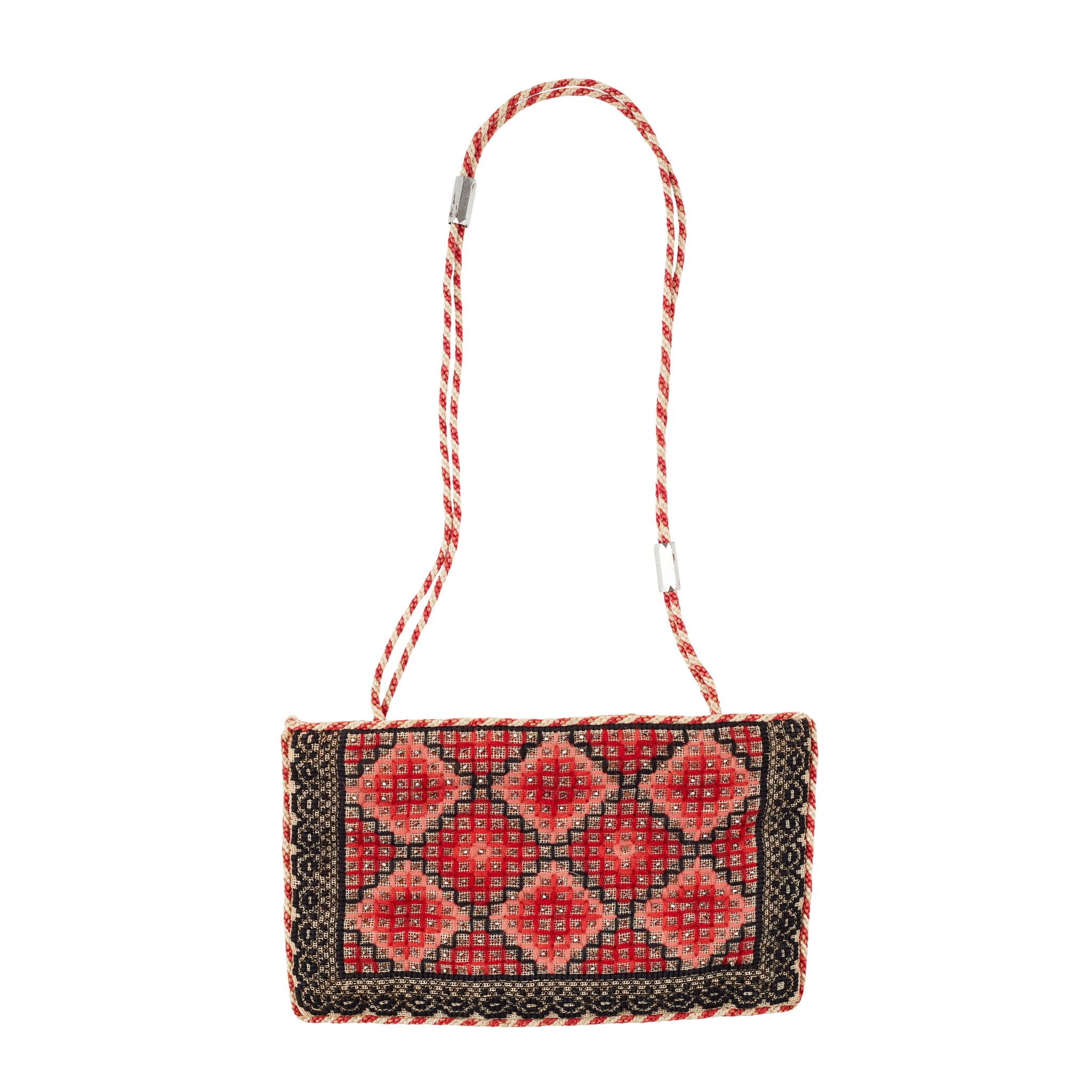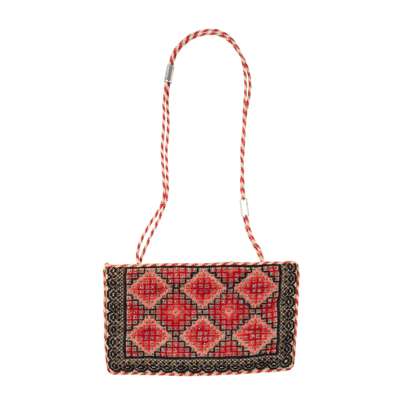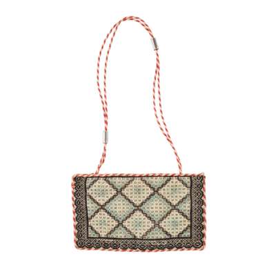 the needlework purse designed with a pattern repeat of diamonds in green to one side, and red to the other, with spangles, lined in red silk, 10cm high, 16.5cm wide; the woolwork purse with braided and bargello work to the body, hung with simple rope and turned silk-covered tassels, 11.5cm high (excluding rope), 14.5cm wide