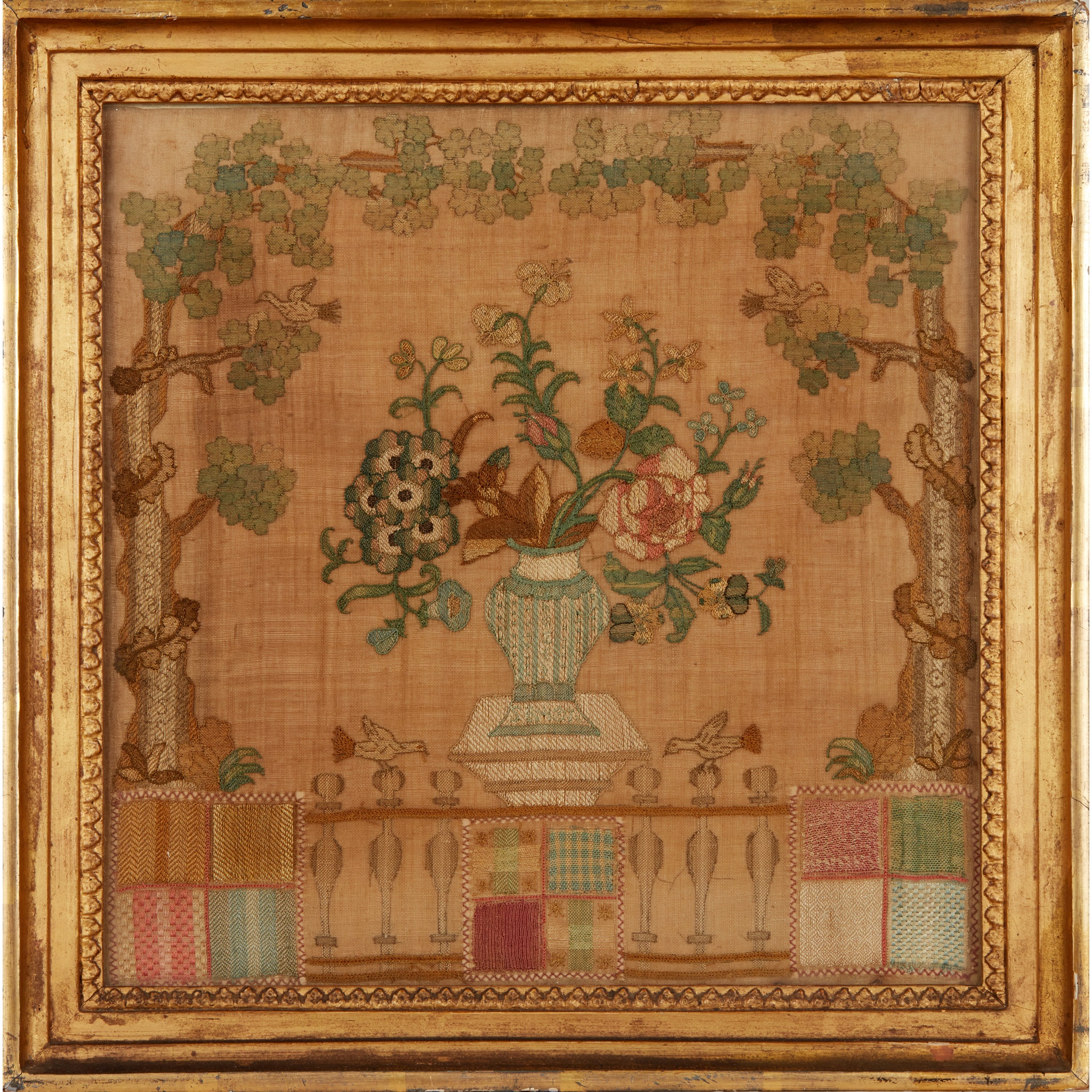 of square form, depicting a vase of flowers behind a balustrade within a border of entwined trees, on a woven ground, in a giltwood frame, with label for 'The Fine Art Society's Exhibition of Old Needlework, Lent by Mrs C. J. Longman'