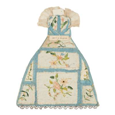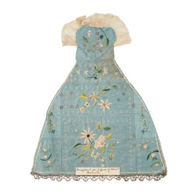 with enamel clasp, with handwritten label 'PETIT POINT BELT. 1760/ BELONGED TO MDME DE CHAVANNE', 132.5cm long approx.; together with a BEADED BELT, 156cm long approx.; and a NEEDLEWORK AND SPANGLED DRESS FRONT FOR A FIGURE, with hand-written labels 'Dress front for figure of Saint/ Spanish', 'Mrs C. J. Longman' and 'Spanish. Front used for a santo. Bought from H Truman', 36cm high, 29.5cm wide