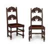 the arched splats carved with masks, scrolls, and stylised leaves and mounted with acorn pendant finials, above panel seats raised on turned and block legs joined by stretchers; with later needlework seat pads