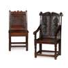to include an armchair with a twin panel back carved with stylised leaf and flower motifs; and a backstool, the panel back carved with a leaf-filled lozenge