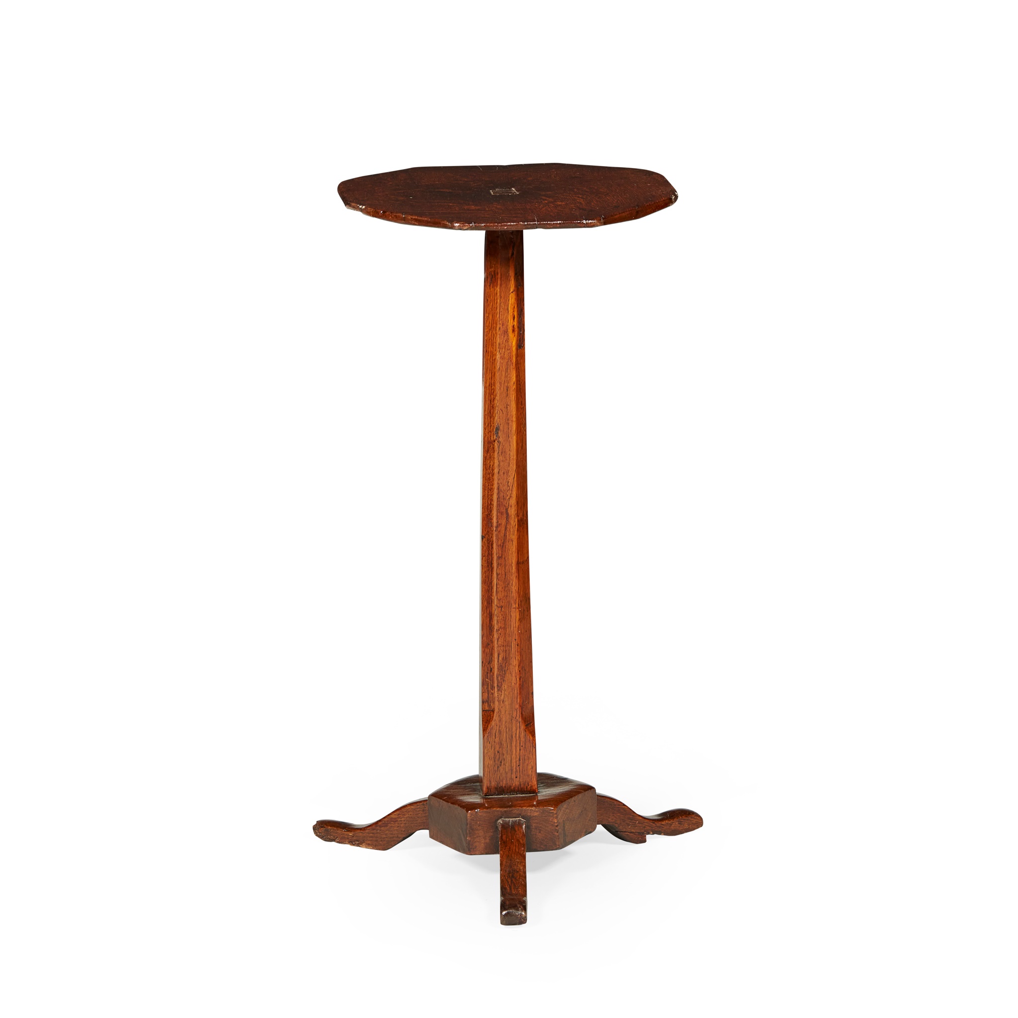 the octagonal top on a tapered octagonal column and hexagonal base with three scrolled legs