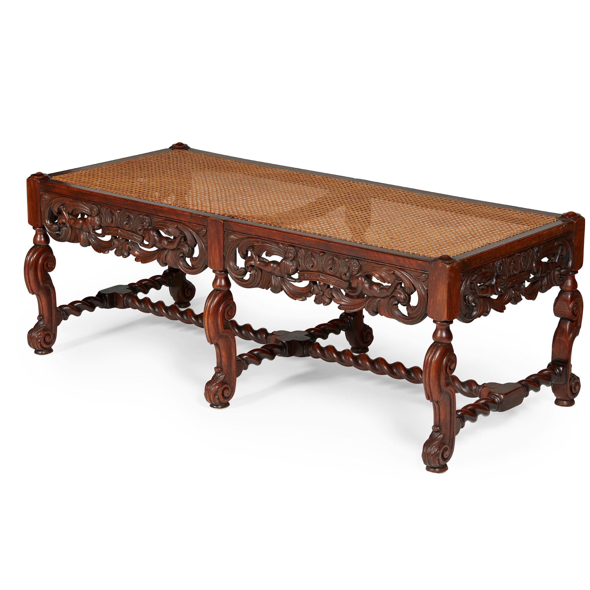the caned seat above a pierced apron carved with acanthus scrolls, coronets, and carved putti, raised on leaf-carved cabriole legs joined by spiral carved stretchers